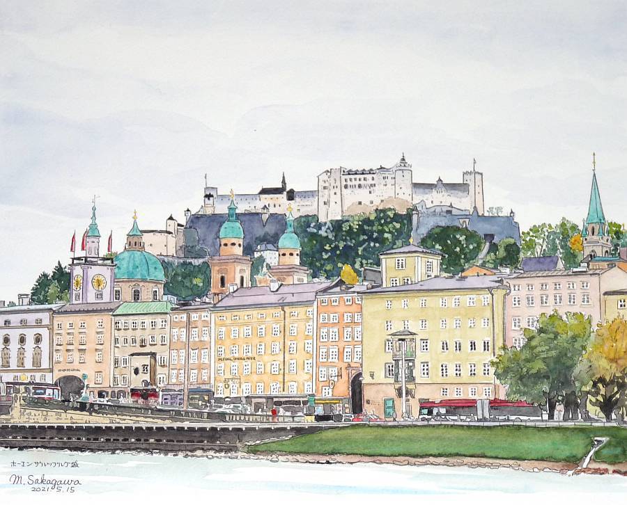 ちなみに・・・川に沿っての旧市街、向かって左手に、時計塔を有している建物が市役所、その奥に『ザルツブルグ大聖堂』の青銅の屋根が3つ見えてます。そして、市役所のその右にはモーツアルトの生家として有名な『ゲブルトハウス』に通じるアーチを持ったアパートもあります。よくよく見ると、窓のカタチや壁の色に個性を持たせ、決して他人と同じことをしないヨーロッパ人の心意気が感じられます。今回描くのに際して、グーグルアースのバーチャル散歩が大いに役立ちました・・・というか、それなしには描けなかったというのが真実!