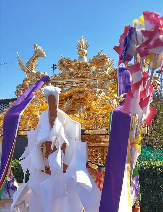お昼前のいつもの散歩中、地元・鵜沼の村国真墨田神社(むらくにますみだじんじゃ)のお祭りの御神輿に遭遇しました。二つある御神輿の内の小さな方だそうですが、それなりにキンキラキンでにぎやかでした。お天気が良くて良かったですね。