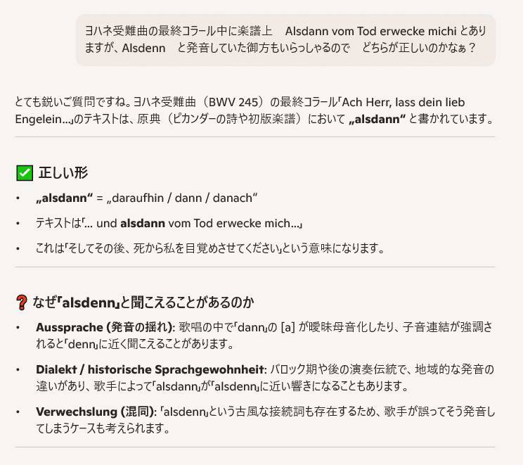 いよいよ明日木曜日からBACH様のオーケストラ合わせ/本番が始まります。今日もドイツ語読みに頑張っていたトットさん・・・今頃、最終曲の楽譜に誤植?とも思われる言葉を見付けて???・・・例によってCopiliotに相談・・・結果は・・・楽譜が正しい!(ネット上の某氏の表示が間違っていた!)ということのようです。さすがペーター版!