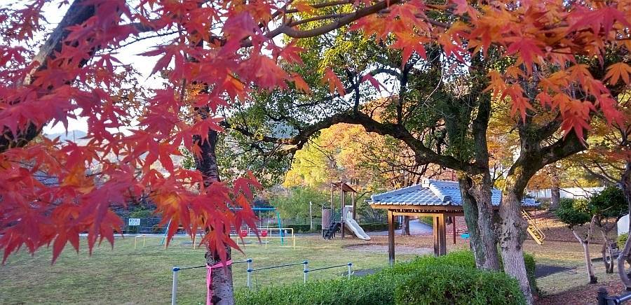 団地の公園のモミジが見事に色付いていたのでついついパチリ・・・皇帝ダリアも見事に咲き、バックの八木山もしっかり風情が出てきています。