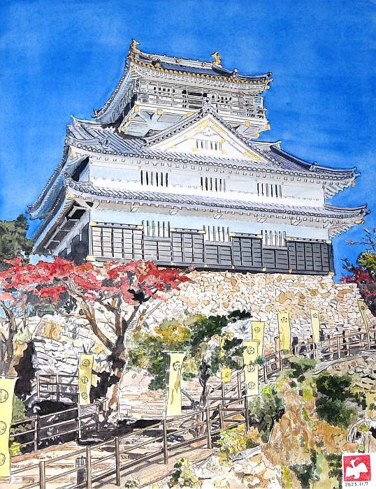 今朝早く、取り掛かって11日目で、なんとか岐阜城の秋が描きあがりました。というのも・・・9月から毎週岐阜バッハ合唱団の練習場に通うたびにライトアップされた金華山のお城を見ているので、そう言えば描いてないなぁ・・・ということで取り掛かったものです。9年前、2016/12/30に一族の忘年会で岐阜に集まった時にお城に皆で登ったのが思い出されます。