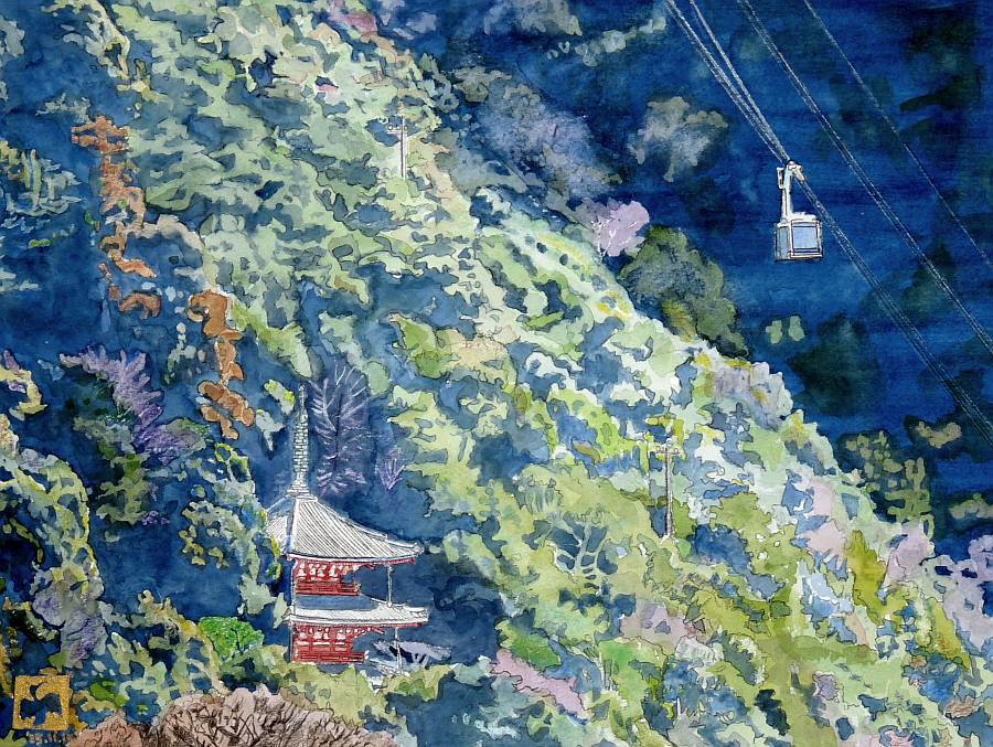 先日の岐阜城に引き続いて描いていた岐阜・金華山の三重塔とロープウエィの水彩画が10日目の本日朝、やっとのことで出来上がりました。今回は漫画墨汁を使わずに藍色でコントラストを付けようとしたのですが、これが大失敗・・・手間がかかり過ぎて大変でした。手法を簡単には変えられないということを痛感・・・