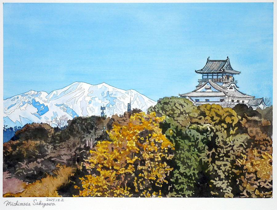 絵の方は、ここしばらく描いていた犬山城と御嶽山のコラボレーション・・・木津用水で有名な犬山市木津からの眺めです。ムカシ、もっとワイドアングルで描いたことがありましたが、今回はドアップにしまして・・・でも、こんな画角にすると枝葉の描き方が面倒で、思ったより3倍くらい手間暇がかかりました。まぁ時間つぶしには最適かも・・・