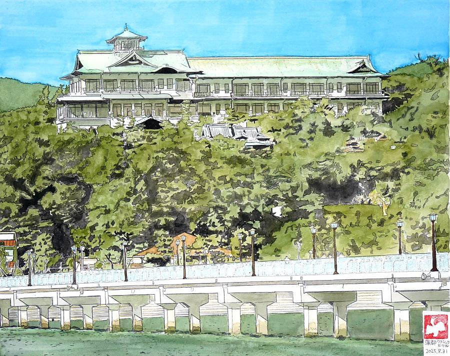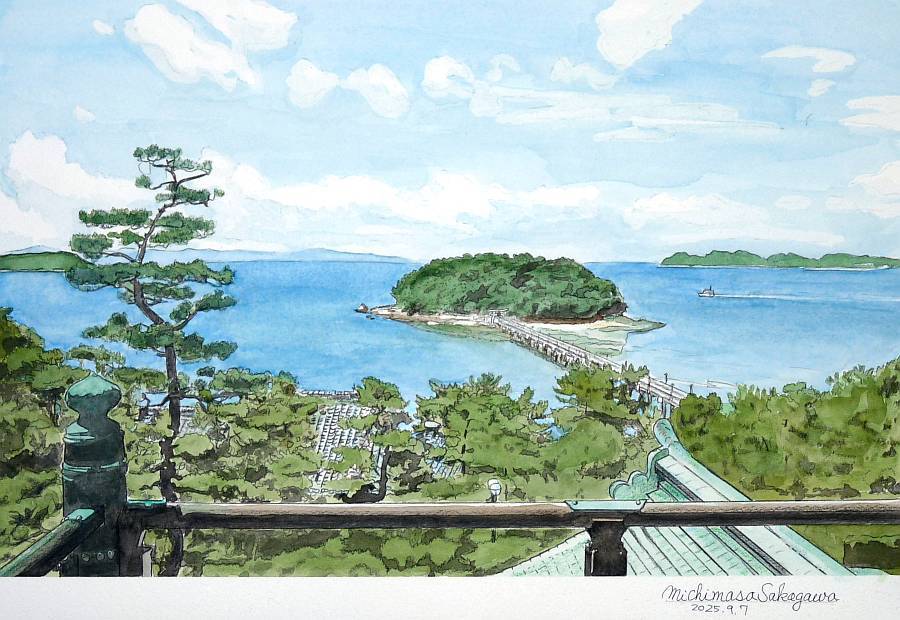 先日描いた蒲郡クラシックホテルの続き・・・ということで、そのホテルから見おろした竹島と三河湾を描いていました。考えて見たら、美濃の風景が中心で、伊勢が続き、尾張名古屋の絵がほんの数点・・・三河の絵は今回が初めて・・・でも、伊勢を除いたら名古屋坂川家の最初の家族旅行は蒲郡だったから、もっと早く描いていても良かったのかな???
