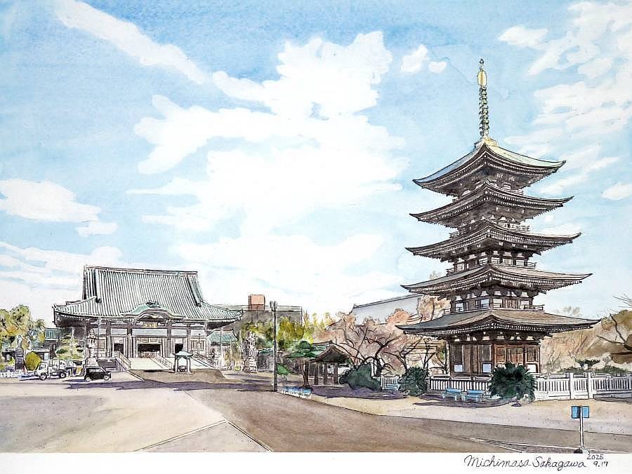 背後に高層マンションがあり、あのバリトンの洞谷吉男先生がお住まいだったと聞いたなぁ・・・とか、タイ国王の銅像を描き込みながら、本堂の金銅仏に思いをはせたり・・・なかなか思い出尽きない日泰寺ではありました。これで五重塔は6枚目になりました。ちなみに、京都市2作品、名古屋市2作品、奈良市1作品、奈良付近(室生寺)1作品ということになります。