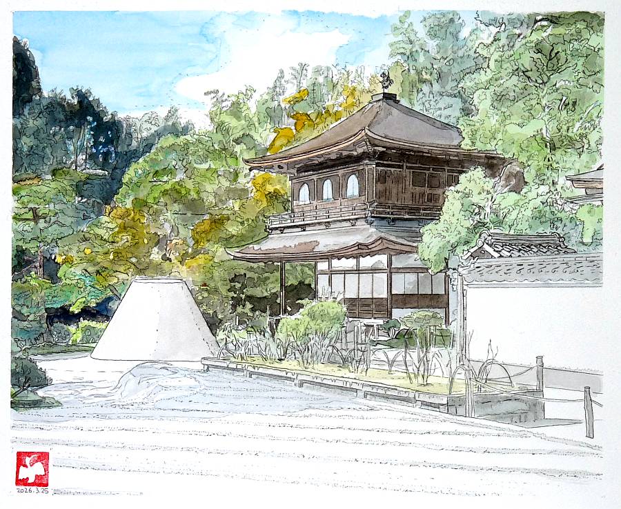 このところ描きはじめていた銀閣寺がやっと出来上がりました。渋い!!! 天候は12時から雨!! 予報通りですね。